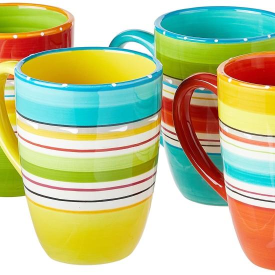 Her bir fincan yaklaşık 470 ml (16 ons) hacme sahip. Seramik malzemeden üretilen fincanlar, sıcak içecekleriniz için ideal. Kahverengi, mavi, kırmızı, sarı ve bej tonlarındaki çizgiler, birbirini tamamlayan bir renk uyumu sergiliyor.