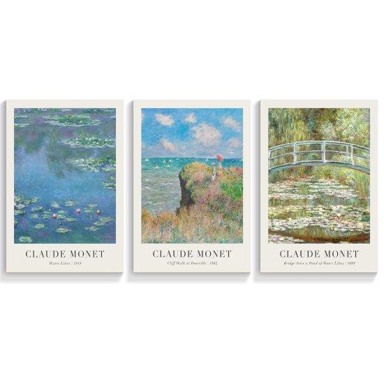 Bu tablo seti, ünlü empresyonist ressam Claude Monet’nin üç farklı eserini bir araya getiren zarif bir duvar dekorasyon ürünüdür. Her bir tablo, Monet’nin benzersiz doğa yorumunu ve renk kullanımını yansıtan özel bir sanat parçasıdır.
