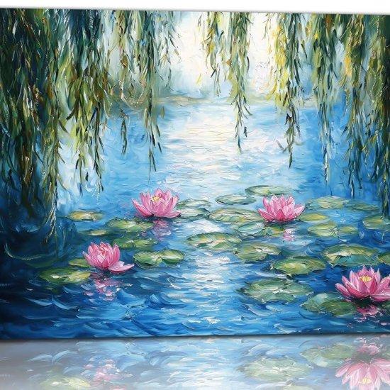 Doğanın büyüleyici güzelliğini yansıtan bu tuval tablo, Claude Monet’nin ünlü nilüfer resimlerinden ilham alınarak hazırlanmıştır. Tabloda, mavi tonların hakim olduğu bir su yüzeyi üzerinde pembe nilüferler ve sarkan söğüt dalları görülmektedir.