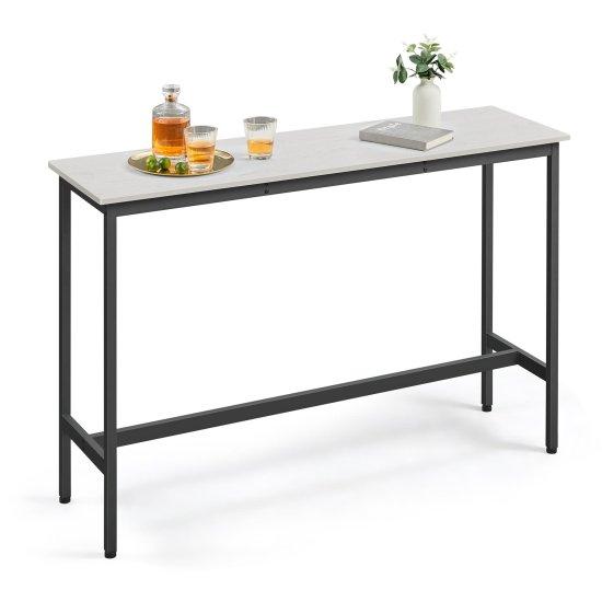 Bu dar mutfak masası, modern endüstriyel stil için ideal bir dekoratif aksesuar. Masanın üst yüzeyi buz beyazı renkte ve pürüzsüz bir dokuya sahip. Metal iskelet siyah renkte, sağlam ve dayanıklı bir çerçeve oluşturuyor.