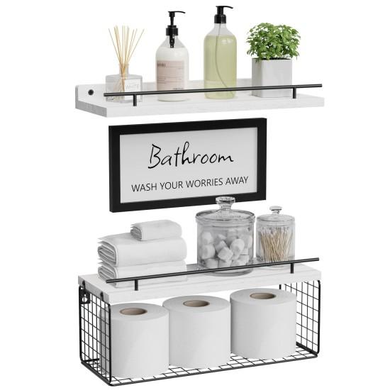 Üst rafta, parfüm şişeleri, bitkiler ve bakım ürünleri için ideal bir alan bulunmaktadır. Orta kısımda dekoratif bir “Bathroom” yazılı tabela, mekana şık bir dokunuş katıyor. Alt kısımdaki tel sepet ise tuvalet kağıtları için pratik bir depolama alanı sağlıyor.