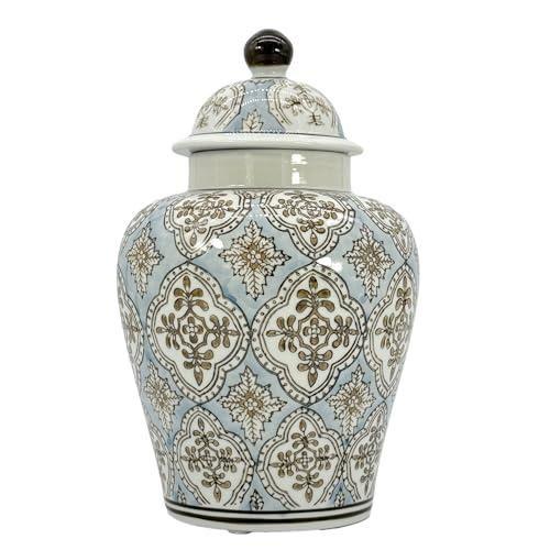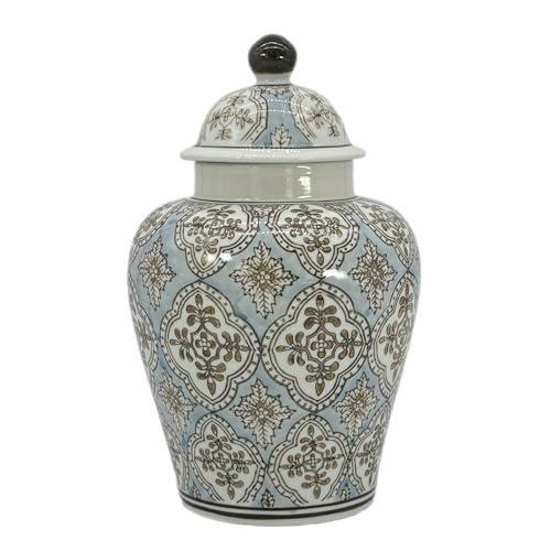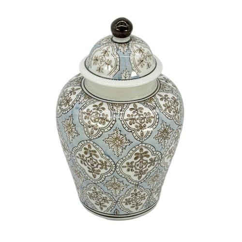 Bu zarif seramik küp, geleneksel Çin desenlerinin modern yorumunu yansıtan etkileyici bir dekoratif aksesuar. Buz mavisi zemin üzerine altın kahverengi detaylı geleneksel motiflerle süslenmiş. Yaklaşık 20 cm yüksekliğinde ve 15 cm genişliğinde olan bu küp, iç mekanlara zarafet katan bir aksesuar.