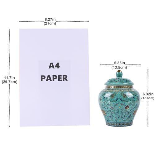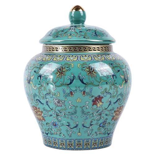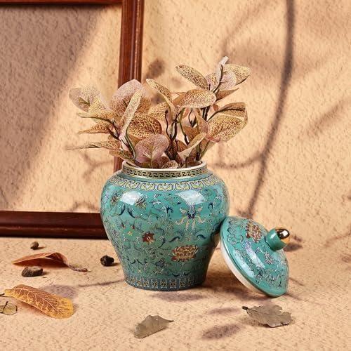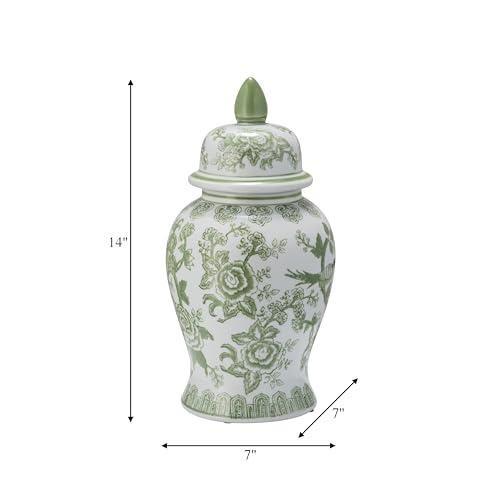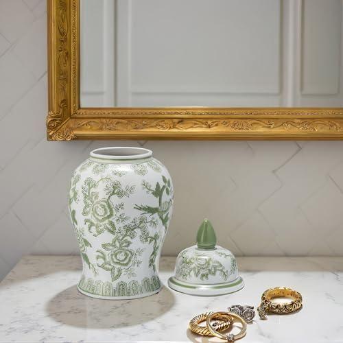 Bu dekoratif küp, geleneksel Çin seramik sanatının zarif bir yorumunu yansıtır. Beyaz zemin üzerine nefis yeşil çiçek ve kuş motifleriyle süslenmiş, klasik bir ginger jar tasarımını sergiler.