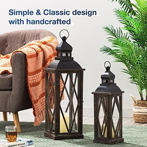 Bu dekoratif fener seti, doğal ahşap çerçevesi ve siyah metal detaylarıyla modern çiftlik evi tarzını yansıtan şık bir aksesuar. İki farklı boyutta tasarlanan fenerler, 28 cm ve 52 cm yüksekliğinde olup açık havada ve iç mekanlarda kullanıma uygundur.
