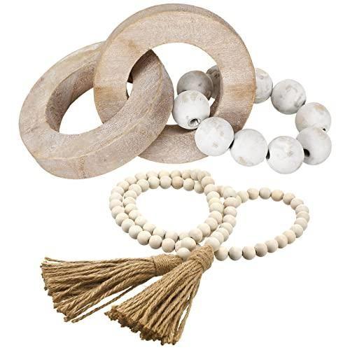 Ürün iki farklı parçadan oluşuyor: Ahşap boncuk çelenk ve ahşap boncuk zinciri. Açık renk ahşap malzeme, doğal ve sade bir görünüm sergiliyor. Alt kısımda yer alan zincir, iki adet kalın jüt püskül ile tamamlanmış. Üst kısımda ise farklı boyutlarda ahşap halkalar ve beyaz ahşap boncuklar bulunuyor.