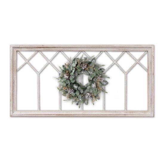 Bu dekoratif pencere çerçevesi, endüstriyel ahşaptan üretilmiş zarif bir duvar aksesuarıdır. Beyaz eskitme dokulu çerçevesi, kırsal ve modern stili mükemmel bir şekilde birleştirir. Çerçevenin iç kısmında, nane yeşili tonlarında yapraklardan ve gri kozalaklardan oluşan zarif bir çelenk bulunmaktadır.