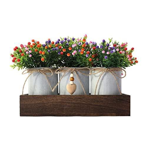 Bu dekoratif ürün, doğal ahşap bir taban üzerinde üç ayrı metal saksıdan oluşan zarif bir çiçek düzenlemesidir. Her saksı, farklı renklerde (kırmızı, mor, turuncu) canlı yapay çiçeklerle doldurulmuştur. Ürün, ev içi dekorasyonlar için ideal bir aksesuar niteliği taşır.