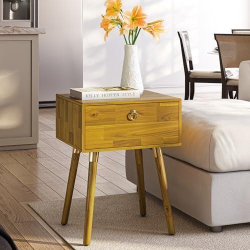 Sarı Ahşap Çekmeceli Dekoratif Yan Sehpa