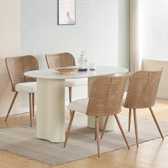 Bu ürün, modern ve şık bir tasarıma sahip dört adet yemek odası sandalyesinden oluşan bir set. Doğal rattan ve katı ahşap sırtlıkla üretilen sandalyeler, mid-century modern tasarım çizgisini yansıtan zarif bir görünüm sergiliyor.