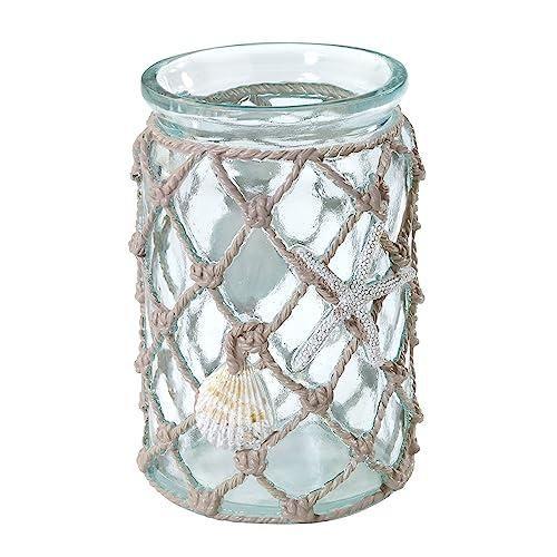 Doğa ve deniz esintilerini evinize taşıyan bu dekoratif aksesuar, modern ve sahil konseptli bir tasarıma sahiptir. Şeffaf cam malzeme üzerine elle örülmüş hasır ağ desenli bir kaplama ile süslenmiş. Açık deniz mavisi ve bej tonlarında zarif bir renk kombinasyonu sergiliyor.