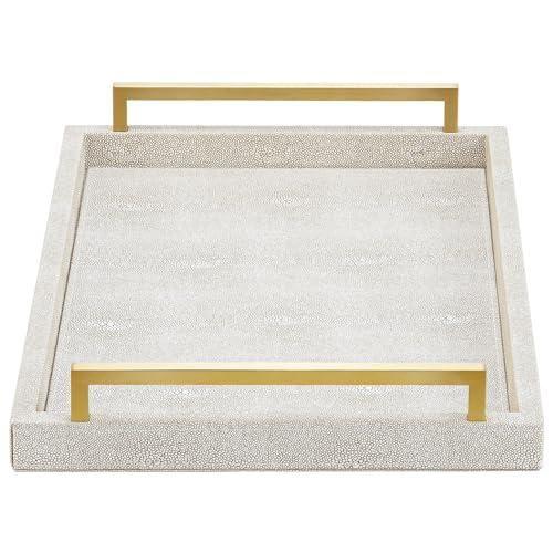 Tepsinin yüzeyi, yumuşak ve pürüzsüz dokulu inci grisi çapraz deri kaplamayla kaplanmıştır. Altın rengi fırçalanmış metal kulpları, ürüne zarif bir görünüm katarken kullanım kolaylığı da sağlıyor. Kulplar sağlam bir tutuş imkanı sunarak tepsiyi taşımayı ve servis yapmayı kolaylaştırıyor.