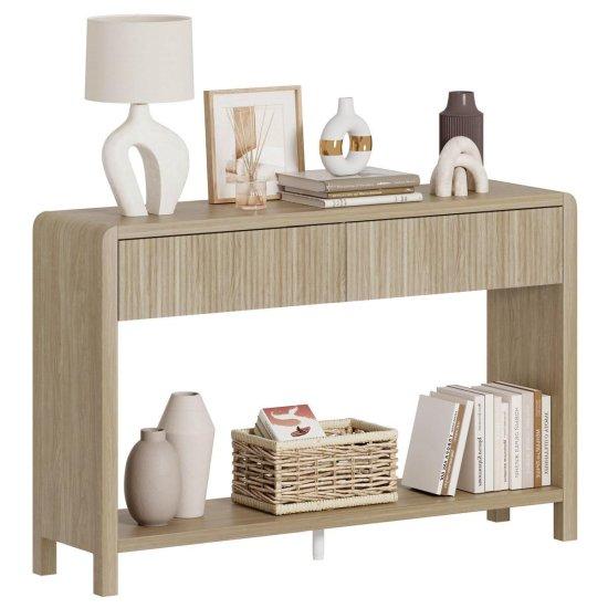 Yaklaşık 120 cm genişliğinde olan sehpa, dar koridorlar, giriş holleri ve oturma odaları için oldukça kullanışlı. Hafif ahşap rengi sayesinde mekanların ferah görünmesine katkıda bulunuyor.