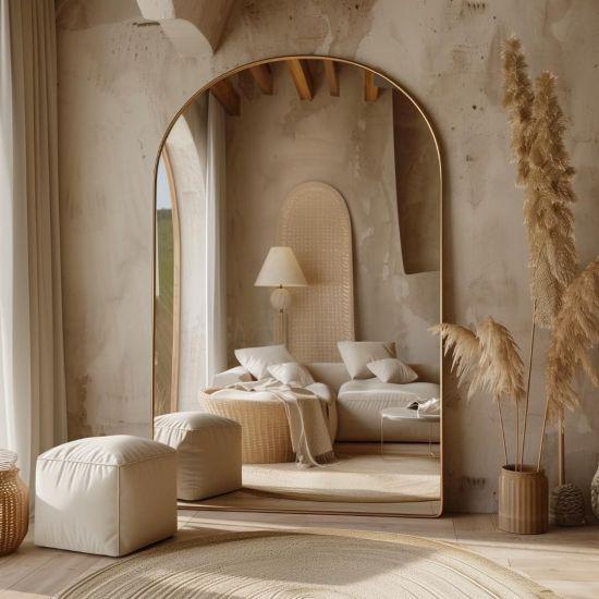 Bu çarpıcı duvar aynası, ışığı ustaca yansıtarak odanızı daha aydınlık ve ferah hale getiriyor. Özellikle küçük alanlarda kullanıldığında, mekanı olduğundan daha geniş gösterme etkisiyle ön plana çıkıyor. Ayrıca, altın rengi çerçevesi sayesinde, doğal ve yapay ışığı yumuşak bir şekilde yansıtarak, bulunduğu ortama sıcak ve davetkar bir atmosfer katıyor.