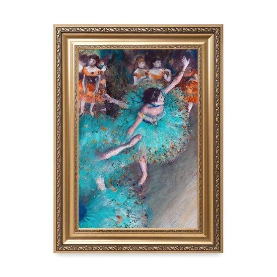 Baskı, canlı turkuaz ve yeşil tonlarında bir balerin figürünü merkezine alıyor. Eserin arka planında diğer balerinler bulanık bir şekilde görülüyor. Degas’ın karakteristik empresyonist tarzını yansıtan çalışma, dans hareketinin dinamizmini ve zarafetini mükemmel şekilde yakalıyor.