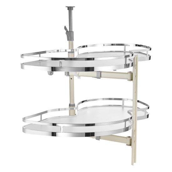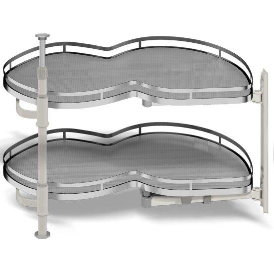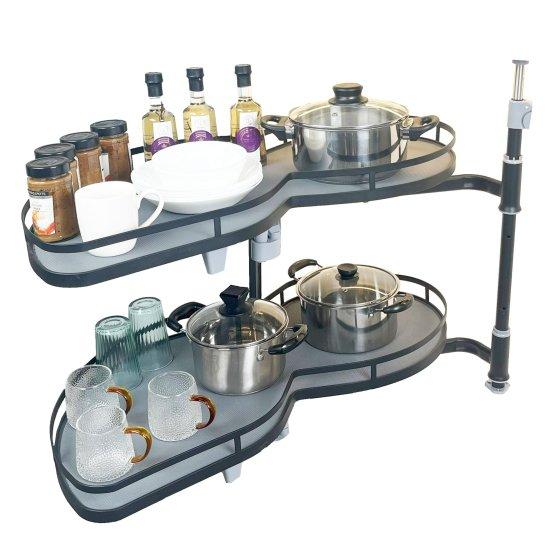 Bu çift katlı dolap içi düzenleyici, mutfak dolaplarınızın köşe alanlarını verimli bir şekilde kullanmanıza olanak sağlar. Yaklaşık 90 cm genişliğinde tasarlanan ürün, yükseklik ayarlı mekanizmasıyla farklı boyutlardaki dolaplara uyum sağlar.