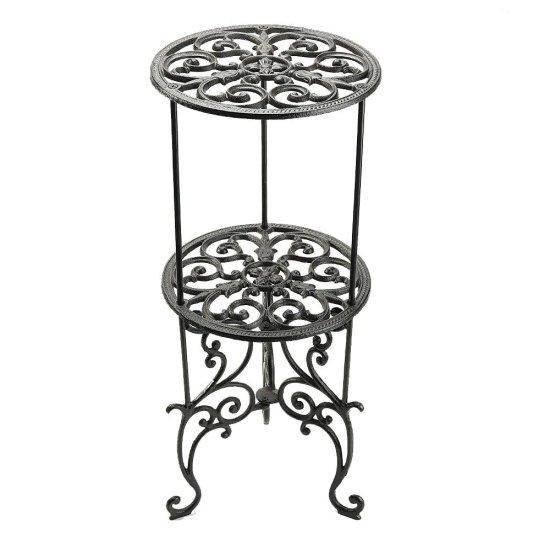 Bu dekoratif ürün, geleneksel ve zarif tasarımıyla dikkat çeken iki katlı bir saksılıktır. Tamamen dökme demirden üretilen saksılık, vintage ve rustik bir stil sergiler. Çift katlı yapısı, farklı boyutlarda bitkilerin veya saksıların yerleştirilmesine olanak sağlar.