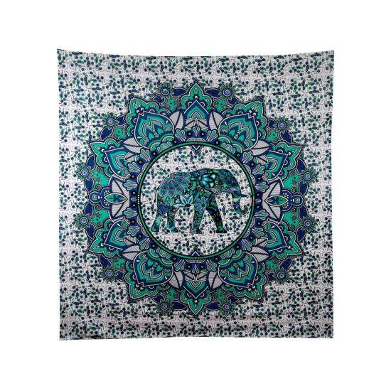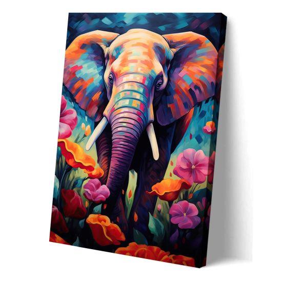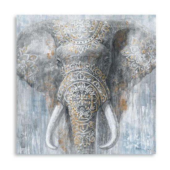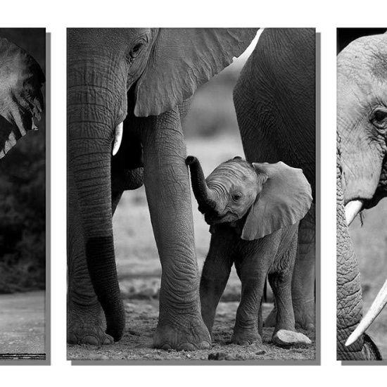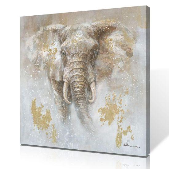 Altın tonlarındaki filler, ince ve uzun gövdeleriyle dikkat çekiyor. Hortumları yukarı doğru kıvrılmış şekilde betimlenmiş, bu da onlara neşeli ve canlı bir görünüm kazandırıyor. Her panelde bir büyük ve bir küçük fil figürü yer alıyor, bu da anne-yavru ilişkisini sembolize ediyor gibi görünüyor.
