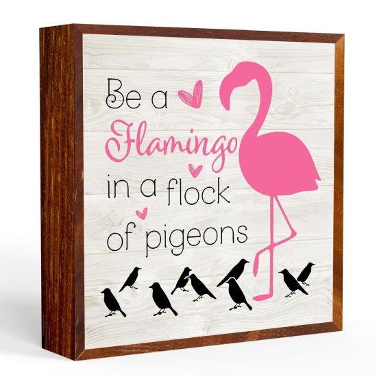 Tabloda, pastel tonlarda bir arka plan üzerinde yedi zarif flamingo resmedilmiştir. Flamingolar, karakteristik pembe tüyleri ve uzun boyunlarıyla dikkat çeker. Her biri farklı duruşlarıyla canlı ve dinamik bir kompozisyon oluşturur.
