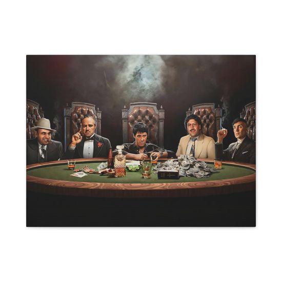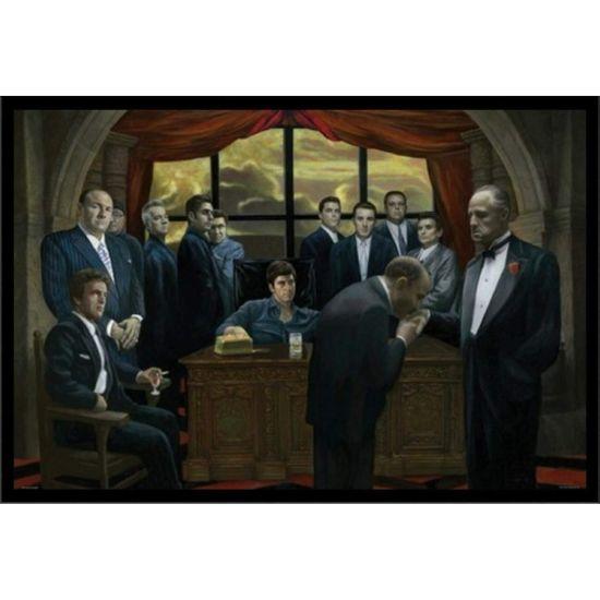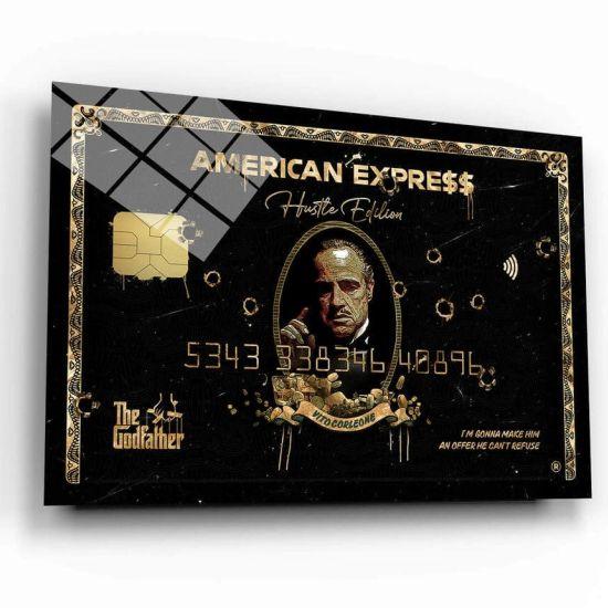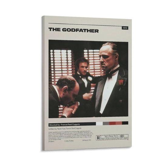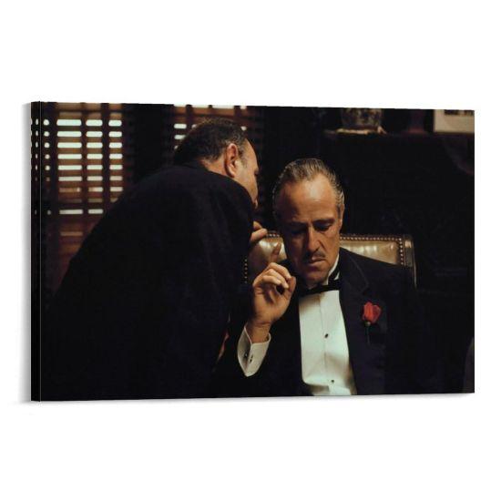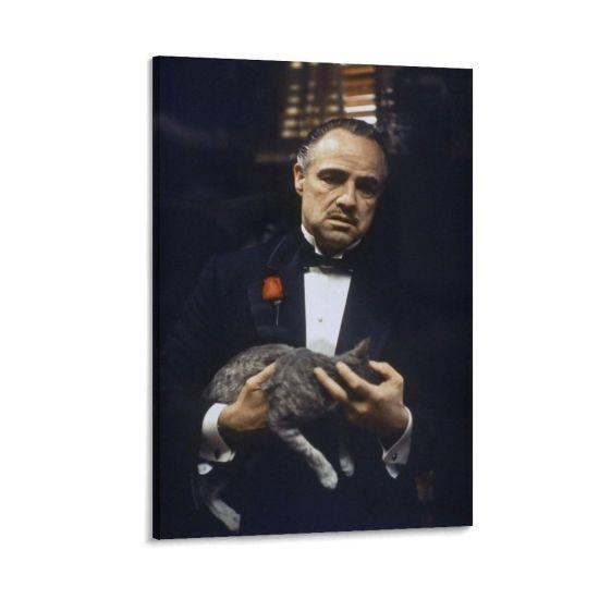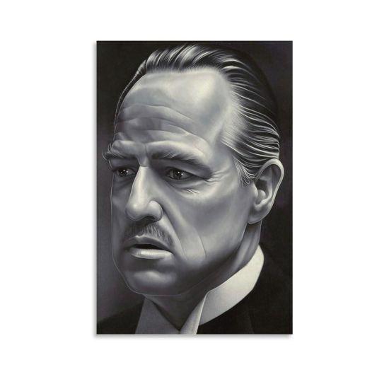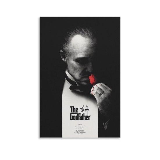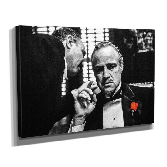 Tabloda, şık bir smokin giymiş Don Corleone karakteri görülüyor. Yakasındaki kırmızı karanfil, siyah-beyaz kompozisyonda dikkat çekici bir kontrast oluşturuyor. Don Corleone’nin yüzündeki ciddi ve düşünceli ifade, karakterin ağırlığını ve otoritesini mükemmel bir şekilde yansıtıyor.