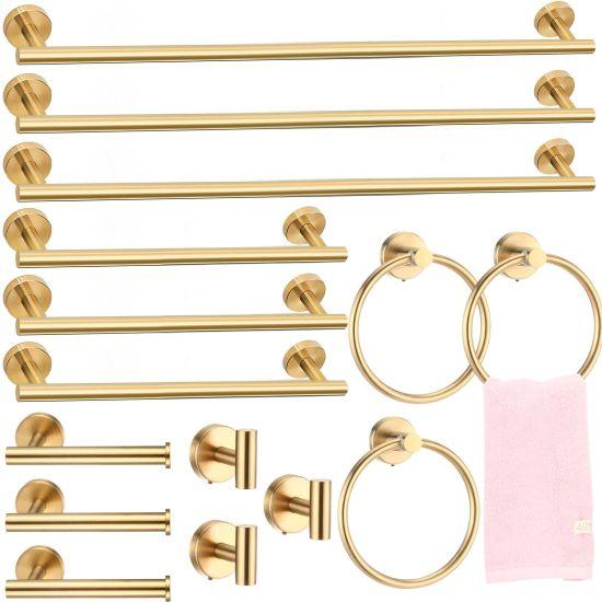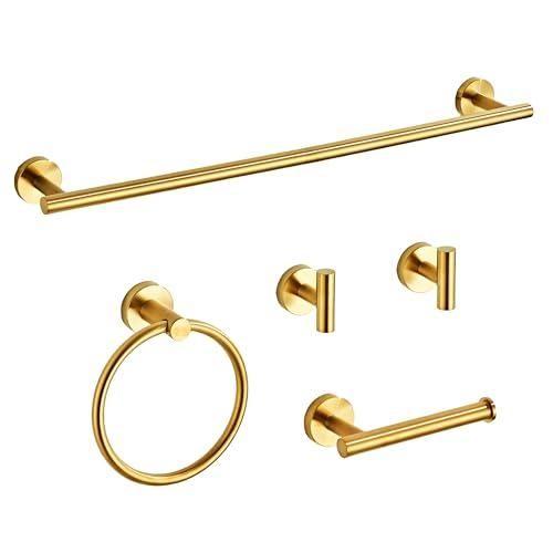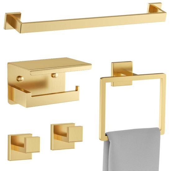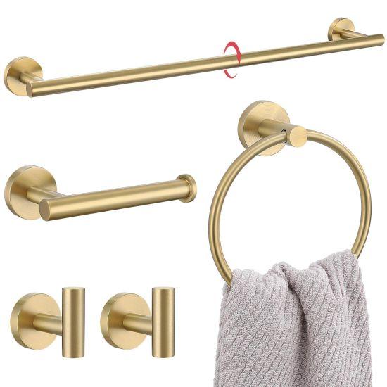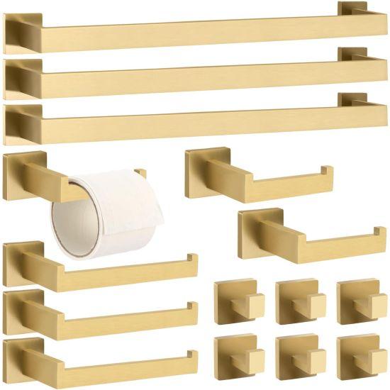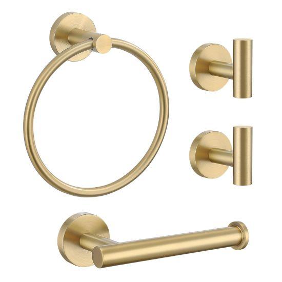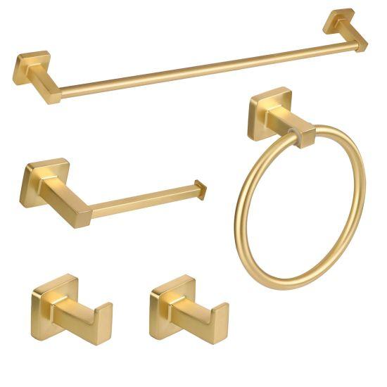 Takım, 45 cm (18 inç) uzunluğunda bir havlu askısı, tuvalet kağıtlığı, diş fırçalığı tutucu, sıvı sabunluk ve diğer gerekli aksesuarları içerir. SUS304 kalite paslanmaz çelik malzeme, dayanıklılık ve uzun ömür garantisi sunar. Altın fırçalanmış kaplama, banyo ortamının nem ve rutubetinden etkilenmez.