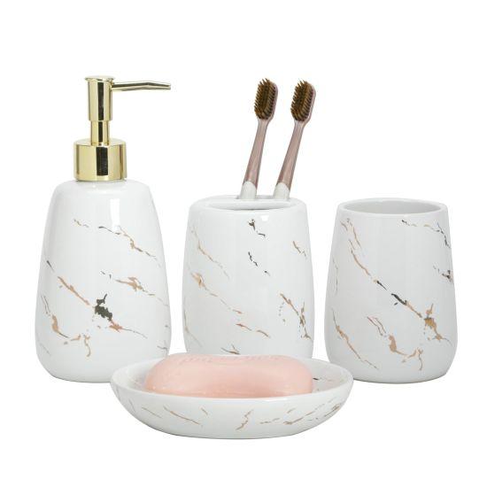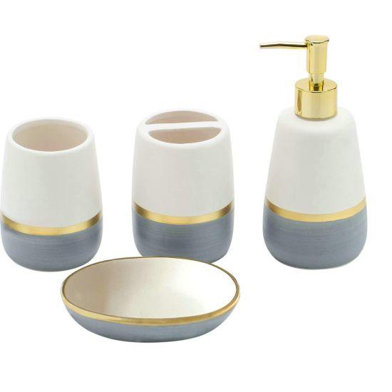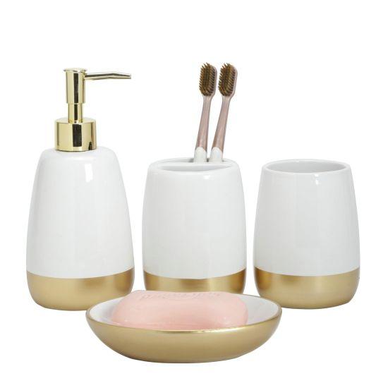 Modern ve zarif bir banyo düzenlemesi için tasarlanan bu aksesuar seti, narin seramik malzemesi ve parlak altın detaylarıyla dikkat çekiyor. Sette dört farklı banyo aksesuarı bulunmaktadır: sabunluk, diş fırçası tutucu, bardak ve sıvı sabunluk.