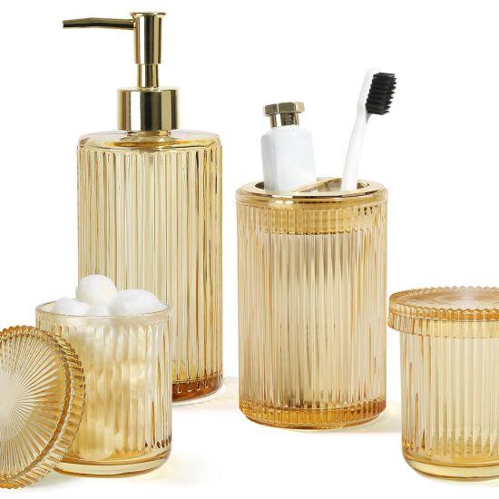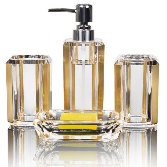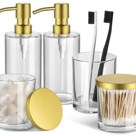 Zarif ve modern banyo dekorasyonları için özel olarak tasarlanmış bu aksesuar seti, şık görünümü ve yüksek kalitesiyle banyolara değer katar. Şeffaf cam ve altın rengi detaylardan oluşan set, 5 parçadan meydana gelmektedir.