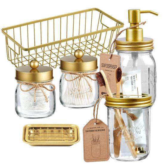 Modern çiftlik evi tarzını yansıtan bu banyo aksesuar seti, geleneksel mason kavanoz stilini şık bir altın dokunuşla birleştiriyor. Altın ve şeffaf cam malzemeden üretilen set, banyolara sıcak ve zarif bir atmosfer katıyor.