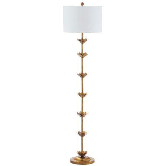 Bu zarif lambader, iç mekan dekorasyonunuz için etkileyici bir aydınlatma çözümü sunmaktadır. Antik altın renkli metal gövdesi, benzersiz yaprak tasarımlı bir dizayna sahiptir. Dikdörtgen beyaz abajuru ile modern ve şık bir görünüm yakalar.