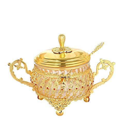 Mutfak ve sofra düzeninin şık tamamlayıcısı olan bu dekoratif aksesuar, göz alıcı tasarımıyla dikkat çekiyor. Parlak altın renkli metal ve şeffaf cam malzemeden üretilen şekerlik, ince işçilikli desenli gövdesi ve zarif detaylarıyla gösterişli bir görünüm sunuyor.