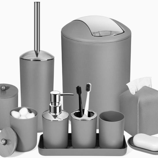 Bu gri banyo seti, modern bir banyo dekorasyonu için kusursuz bir aksesuar grubudur. Toplamda 10 parçadan oluşan set, her detayı düşünülmüş pratik ürünler içerir.