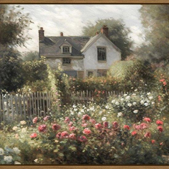 Bu tuval tablo, İngiliz kırsalının romantik ve pastoral atmosferini mükemmel bir şekilde yansıtan bir sanat eseridir. Yumuşak tonlarda yağlı boya tekniğiyle işlenmiş resim, küçük bir cottege ve etrafındaki zengin çiçek bahçesini betimliyor.
