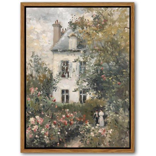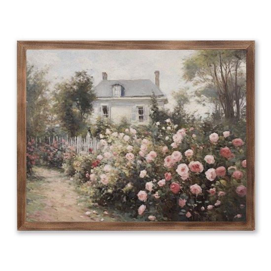 Bu dekoratif tablo, vintage tarzda bir kır evini ve çevresindeki zengin çiçek bahçesini betimleyen zarif bir sanat eseridir. Resimde, beyaz boyalı iki katlı bir ev, etrafında çeşitli renklerde güller ve çiçeklerle çevrili doğal bir manzara görülmektedir.