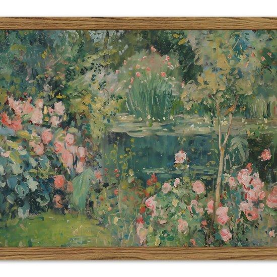 Bu dekoratif tablo, doğanın güzelliğini ve huzurunu yansıtan eşsiz bir sanat eseridir. Yumuşak yeşil tonlar ve pembe gül renkleriyle bezeli tabloda, pastoral bir gül bahçesi ve küçük bir havuz manzarası canlandırılmış.