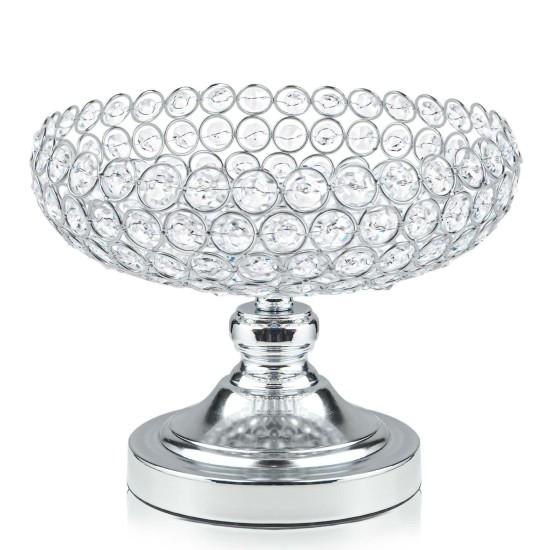 Bu dekoratif aksesuar, mutfak ve salon için zarif bir meyve sunumu çözümü sunar. İnce işçilikli kristal tasarımı, çok sayıda küçük yuvarlak halkanın bir araya gelmesiyle oluşturulmuştur. Gümüş renkli metal ayak üzerine monte edilmiş, parlak ve şeffaf görünümlü bir meyve tabağıdır.