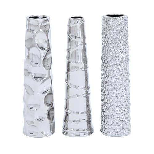 Bu dekoratif vazo seti, modern iç ve dış mekan dekorasyonu için ideal bir aksesuar grubudur. Üç farklı vazodan oluşan set, gümüş rengi tonlarında ve birbirinden benzersiz dokusal desenlerle tasarlanmıştır.