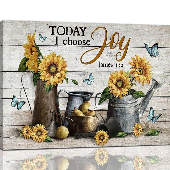 Tablo, “Today I choose Joy” yazısı ve İncil’den James 1:2 referansı ile duygusal bir mesaj taşıyor. Çok sayıda güneş çiçeği, eskitme metal sürahiler ve meyveler ile desteklenen kompozisyon, sıcak ve samimi bir atmosfer yaratıyor.
