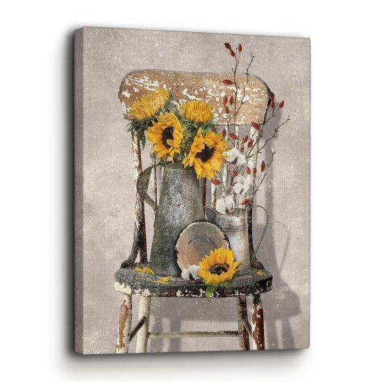 Bu dekoratif tablo, nostaljik bir çiftlik evi estetiğini yansıtan benzersiz bir sanat eseridir. Soluk gri arka plan üzerinde, eskitilmiş tahta bir sandalye ve üzerinde sarı güneş çiçekleri bulunan tuval baskı, doğal ve sıcak bir atmosfer yaratır.