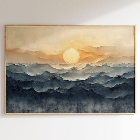 Tablo, pastel tonlarla oluşturulmuş sakin bir atmosfer sunuyor. Krem rengi bir arka plan üzerinde, altın sarısı bir güneş denizden yükseliyor. Güneşin ışınları ince çizgiler halinde yayılarak dinamik bir görüntü oluşturuyor. Mavi tonlarındaki dalgalı çizgiler denizi temsil ediyor ve tabloya derinlik katıyor.