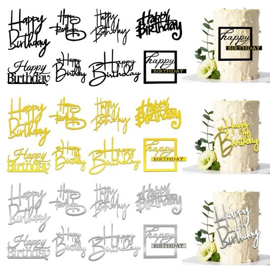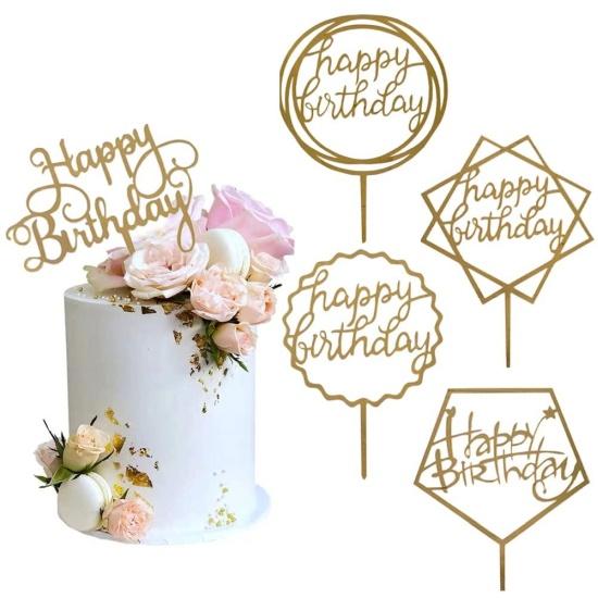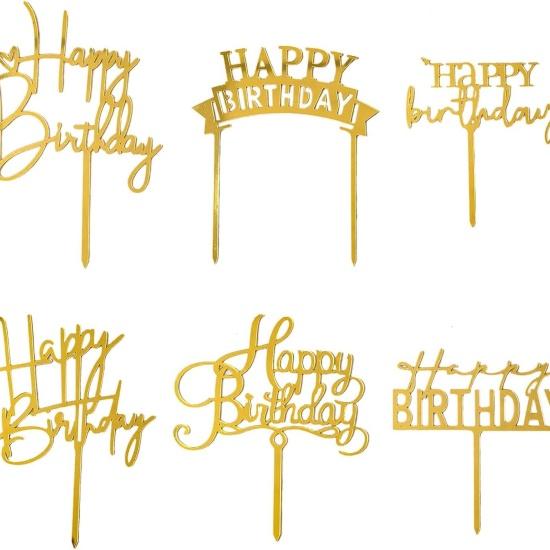 Ürün, şeffaf akrilik malzemeden imal edilmiş olup, parlak altın rengi ile göz alıcı bir görünüm sergiler. Farklı geometrik şekillerde (yuvarlak, kare, beşgen) tasarlanan süsler, “Happy Birthday” yazısını içerir. Her bir parça, pasta üzerine konulduğunda şık ve özel bir görünüm sağlar.