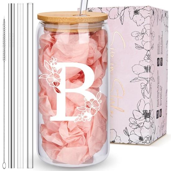 Bu bardak seti, kişiselleştirilmiş bir hediye konseptinde tasarlanmış şık bir içecek aksesuarıdır. Şeffaf cam gövdesi, zarif bir pembe arka plan üzerine beyaz çiçek desenleriyle süslenmiş “B” harfi içerir.