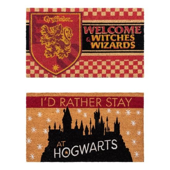 “Welcome Witches and Wizards” ve “I’d Rather Stay at Hogwarts” yazıları paspasların eğlenceli mesajlarını oluşturur. Zeminde kar tanesi desenleri bulunur.