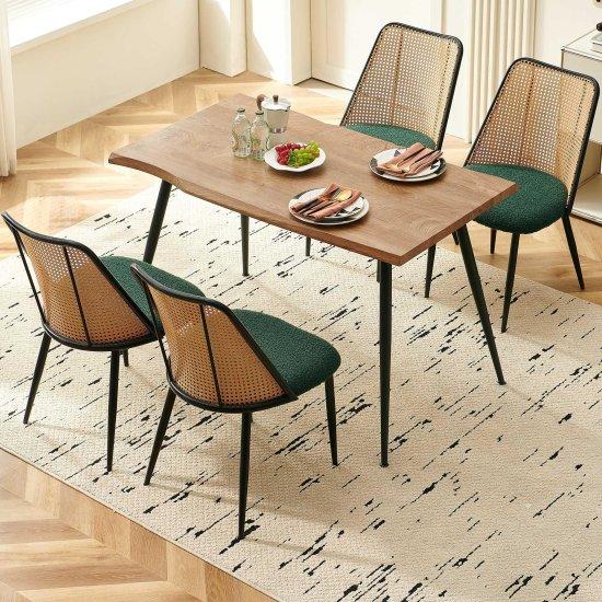 Masa ve sandalyelerin rengi açık ahşap tonunda olup, yumuşak ve doğal bir görünüm sergiliyor. Sandalyelerin sırtları özenle örülmüş hasır desenli, hem estetik hem de rahatlık sağlıyor. Dikdörtgen masa yaklaşık 110 cm genişliğinde, dört kişinin rahatça oturabileceği boyutta tasarlanmış.