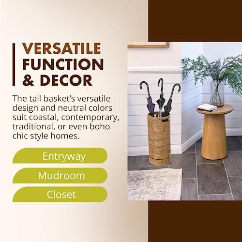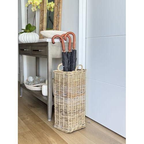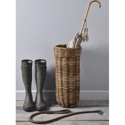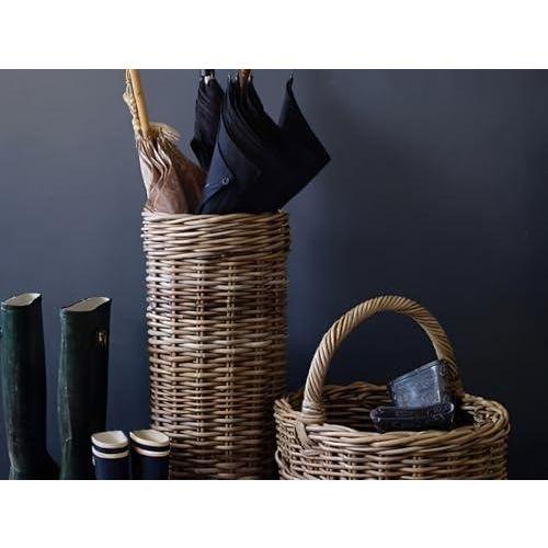 Bu dekoratif aksesuar, doğanın sunduğu şık ve pratik bir çözümdür. Tamamen el yapımı rattan malzemeden üretilen şemsiyelik, doğal tonlarda kahverengi dokulu bir görünüme sahiptir. Yüksekliği yaklaşık 55 cm ve çapı 25 cm olan ürün, dar girişler ve küçük mekanlar için ideal bir depolama çözümüdür.