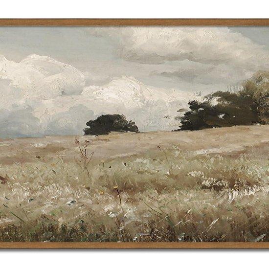 Tablonun renk paleti, toprak tonlarında yumuşak ve uyumlu. Açık gri bulutlu gökyüzü, soluk kahverengi çayırlar ve koyu yeşil ağaç siluetleri bir arada harmonik bir manzara oluşturuyor. Resmin dokusu, fırça darbeleriyle zengin ve detaylı, adeta elle boyanmış gibi doğal bir görünüm sergiliyor.