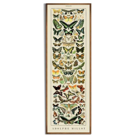 Bu ince uzun tablo, doğanın zenginliğini ve kelebeklerin muhteşem çeşitliliğini gösteren etkileyici bir sanat eseridir. Çerçevesi koyu tonlarda ahşap görünümlü bir çerçeve olup, tablonun vintage tarzını desteklemektedir.