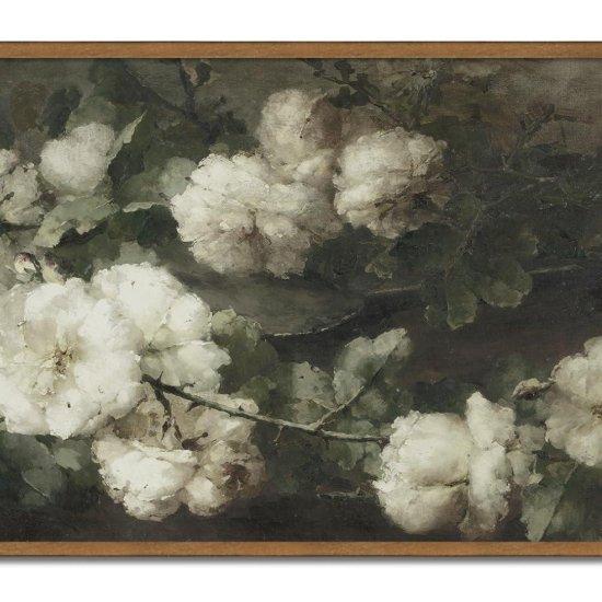 Tablo, soluk tonlarda beyaz çiçeklerin yumuşak ve detaylı bir yağlı boya görünümünde resmedildiği bir kompozisyona sahiptir. Çiçekler yumuşak gri-yeşil yapraklar arasında dağınık bir şekilde konumlandırılmış, nostaljik ve romantik bir atmosfer yaratmaktadır.