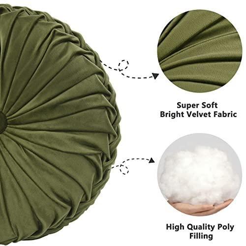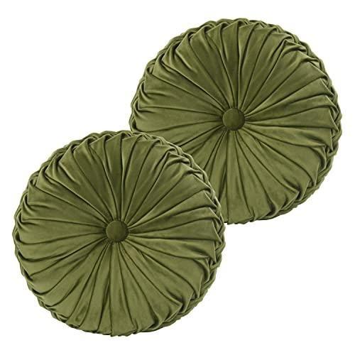 Yaklaşık 37 cm çapındaki kırlentler, zeytin yeşili kadife kumaştan üretilmiş. Elle dikilen pilili tasarımı sayesinde hem dokunsal hem görsel açıdan oldukça çekici. Merkezindeki düğme detayı tasarıma ekstra bir zarifet katıyor.