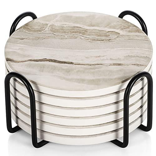 Set, altı adet emici taş bardak altlığından ve pratik bir tutucu aparattan oluşuyor. Doğal taş malzeme, sıvıları hızla emen ve masanızı koruyan özellikleriyle öne çıkıyor. Açık gri ve bej tonlarındaki renk seçenekleri, farklı dekorasyon stillerine uyum sağlıyor.