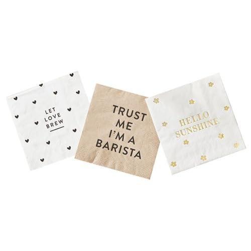 Peçetelerin üzerindeki “Let Love Brew” ifadesi, aşk ve kahve tutkusunu zarif bir şekilde birleştiriyor. Etrafındaki küçük kalp desenleri ise romantik bir dokunuş katıyor. Hem pratik hem de dekoratif olan bu peçeteler, sofra düzenine şıklık katacak nitelikte.