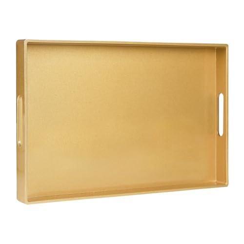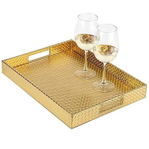 Parlak gold yüzeyi suya dayanıklı ve kolayca temizlenebilir. Kenarlarında 3,5 cm yüksekliğinde kenar payı bulunur, bu sayede üzerindeki eşyaların düşmesini engeller. Oval tasarımlı kulpları sayesinde rahatça taşınabilir.